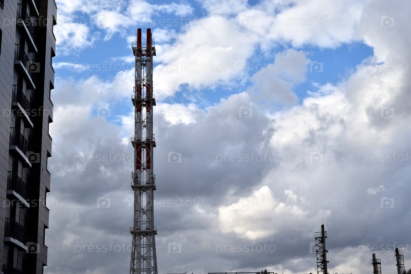 Стальная труба ТЭЦ на фоне голубого неба и облаков возле дома