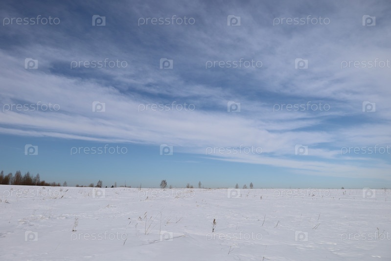 Заснеженное поле и голубое небо с перистыми облаками