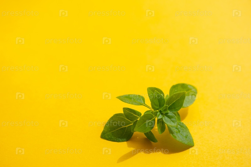 Лист сырого зеленого органического базилика для салата на желтом фоне
