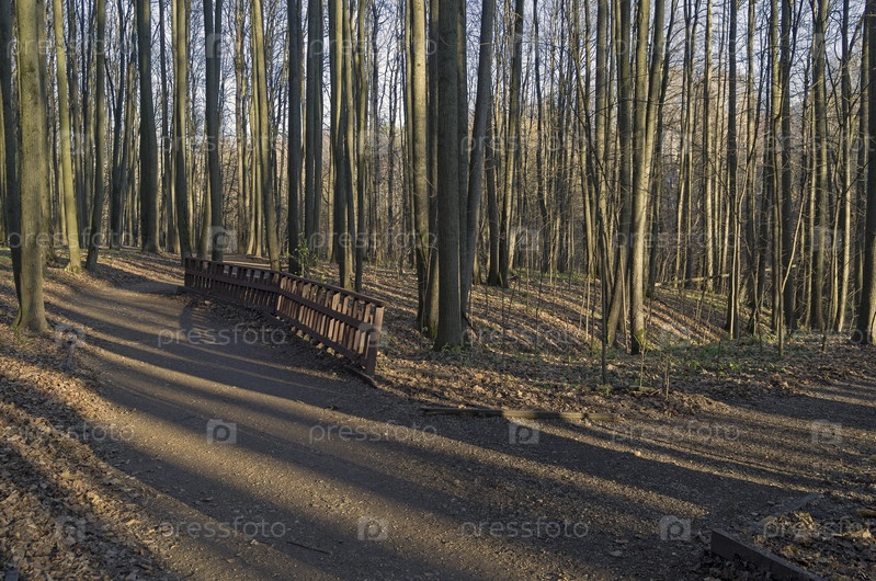 Тени от деревьев на пешеходной дорожке в осеннем лесу. Битцевский парк, Москва, солнечный день в начале ноября