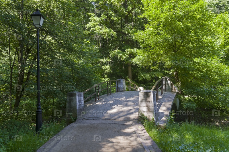 Небольшой красивый пешеходный мостик через овраг. Царицынский парк, Москва, Россия. Солнечный день в июне