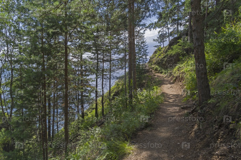 Большая Байкальская Тропа на крутом лесном склоне на берегу озера Байкал. Окрестности поселка Большие Коты, Прибайкальский национальный парк, Иркутская область, солнечный день в августе