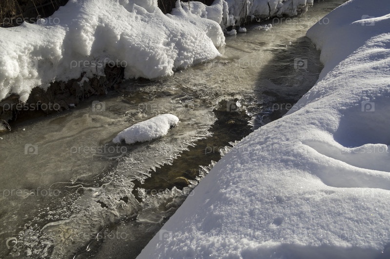 Кристаллы льда над незамерзающим участком лесного ручья. Солнечный день в феврале