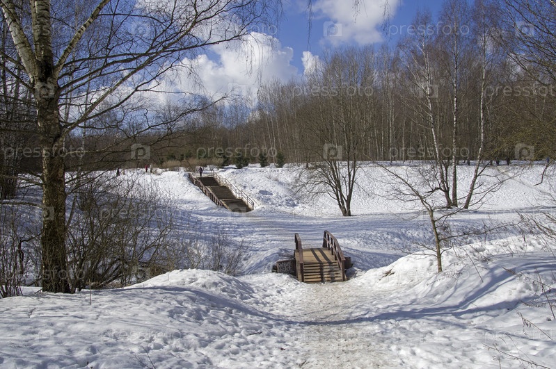 Мостик через ручей на дне небольшого оврага. Теплостановский лесопарк, Москва. Солнечный день в конце марта