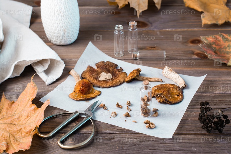 Сушеные нарезанные мухоморы сложены в небольшую банку, а сухие грибы на пергамент и ножницы на деревянном столе. Микродозирование и альтернативная медицина