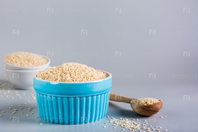 Семена белого кунжута в миске и в деревянной ложке на сером фоне. Органическая диета