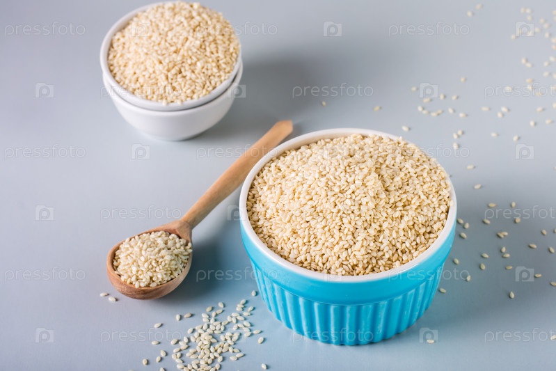 Семена кунжута в мисках и деревянной ложкой на сером фоне. Органическая еда