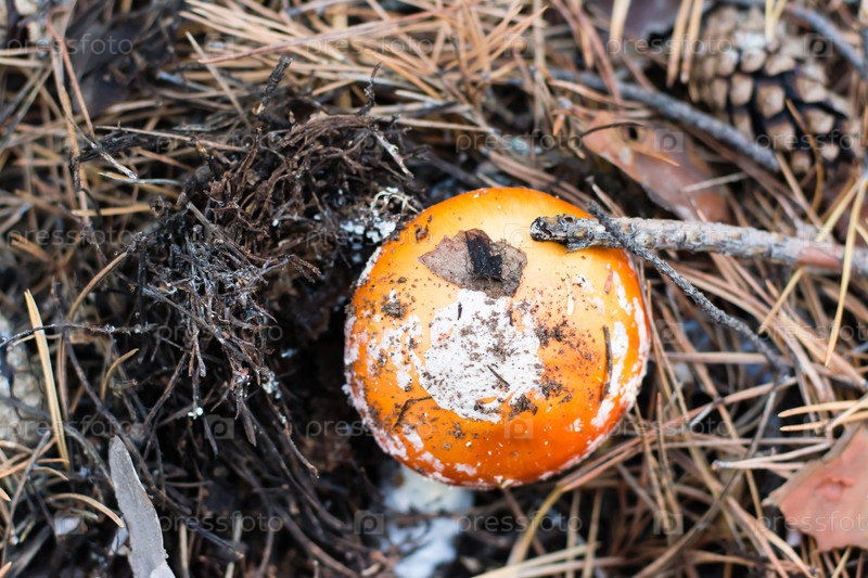 Мухомор на лесной хвое. Сбор грибов Вид сверху