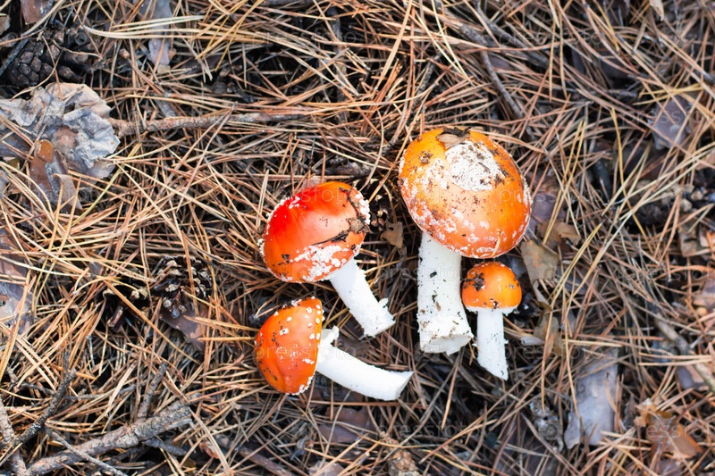 Свежесрезанный мухомор на лесной хвое. Сбор грибов Вид сверху