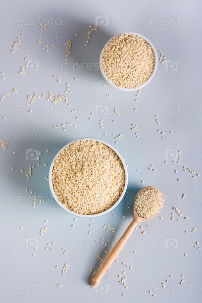 Семена кунжута в мисках и деревянной ложкой на сером фоне. Органическая еда. Сверху и по вертикали