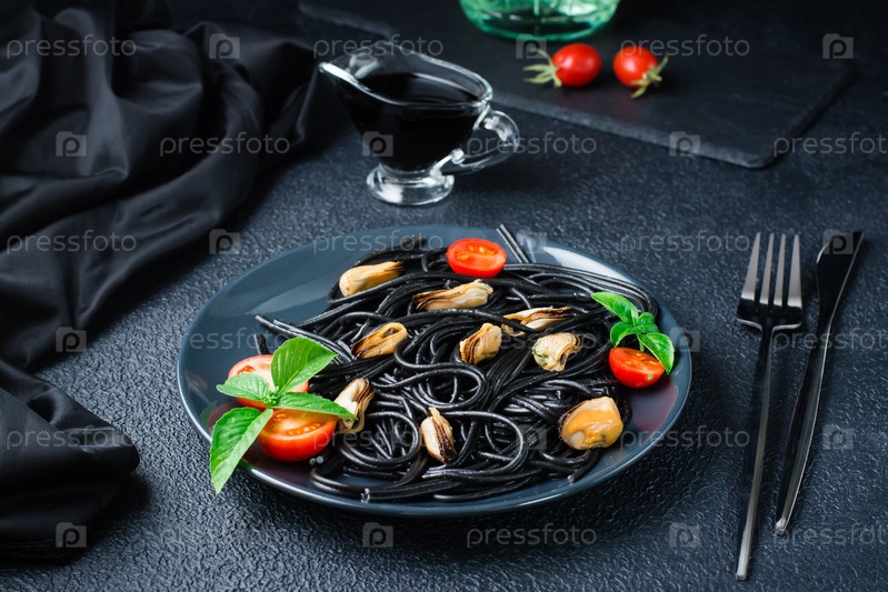 Готовые к употреблению черные спагетти с мидиями, помидорами и базиликом на тарелке на черном фоне. Фотография еды в темных тонах
