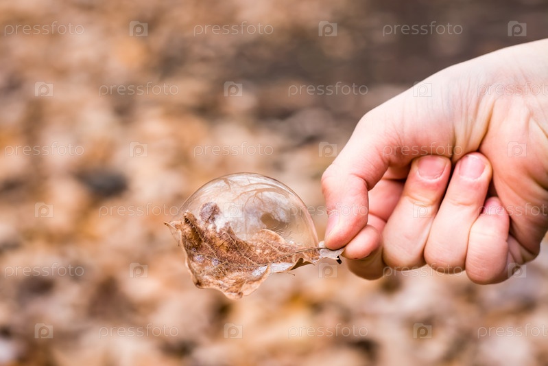 Мыльный пузырь на сухом дубовом листе в детской руке в парке. Понятие хрупкости и нестабильности. Детский досуг