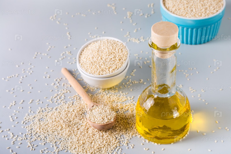 Кунжутное масло в стакане и семена в миске на столе. Органическая альтернативная еда