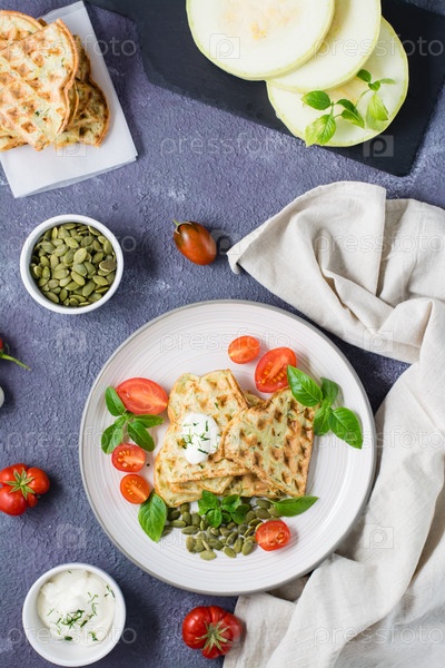 Аппетитные вафли из кабачков, помидоры, тыквенные семечки и зелень на тарелке на столе. Овощное диетическое вегетарианское питание. Вертикальный и вид сверху
