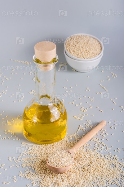 Кунжутное масло в стакане и семена в миске на столе. Органическая альтернативная еда. Вертикальный вид