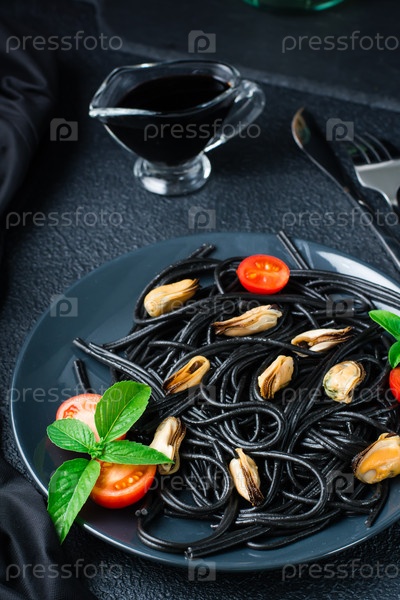 Готовые к употреблению черные спагетти с мидиями, помидорами и базиликом на тарелке и соевым соусом на черном фоне. Фотография еды в темных тонах. Крупный план. Вертикальный вид