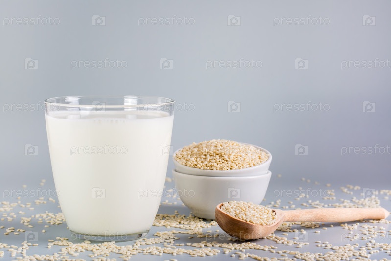 Кунжутное молоко в стакане и семена в миске на столе. Молочная альтернатива