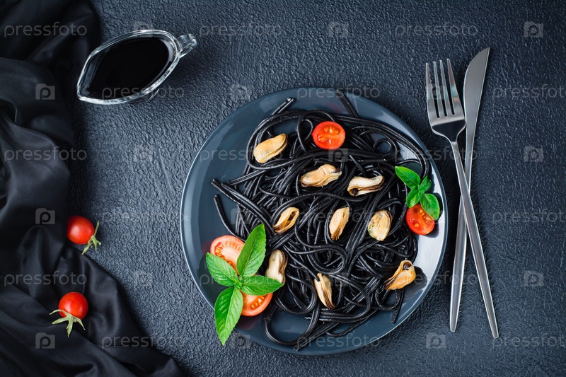 Готовые к употреблению черные спагетти с мидиями, помидорами и базиликом на тарелке на черном фоне. Фотография еды в темных тонах. Вид сверху