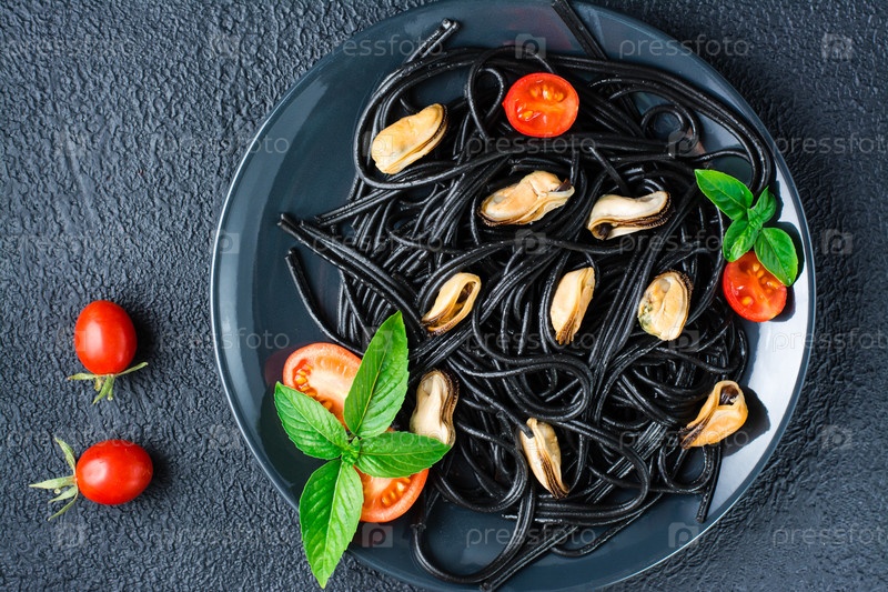 Готовые к употреблению черные спагетти с мидиями, помидорами и базиликом на тарелке на черном фоне. Фотография еды в темных тонах. Вид сверху. Крупный план
