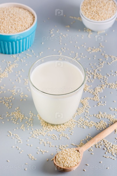 Вегетарианское овощное альтернативное кунжутное молоко в стакане и семена в миске на столе. Вертикальный вид