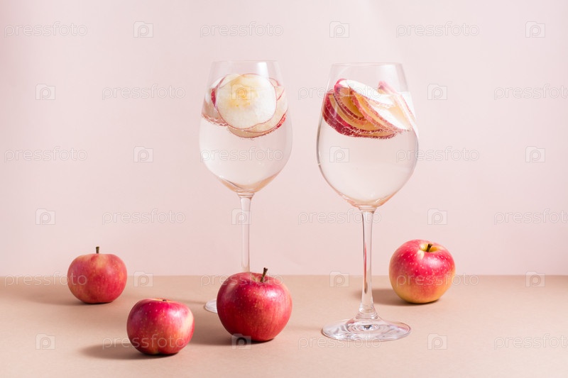 Освежающий коктейль из кусочков яблока и минеральной воды в бокалах на розовом фоне. Оздоровительный детокс-напиток