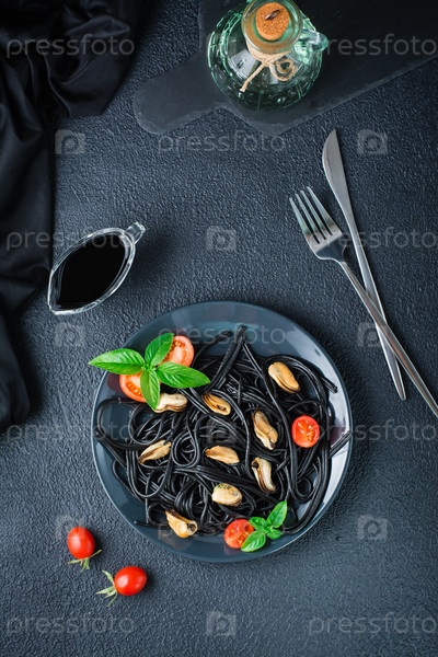 Готовые к употреблению черные спагетти с мидиями, помидорами и базиликом на тарелке на черном фоне. Фотография еды в темных тонах. Верхний и вертикальный вид