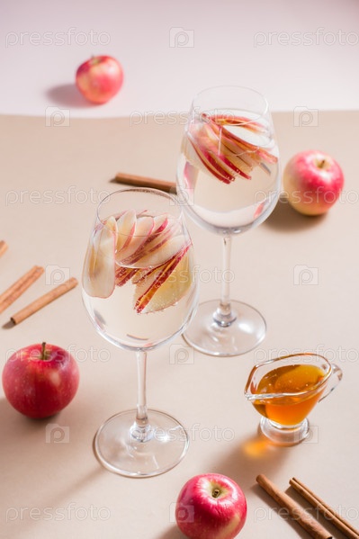 Освежающий коктейль из кусочков яблока и минеральной воды в стаканах, меда и корицы на коричневом фоне в резком свете. Детокс оздоровительный напиток. Вертикальный вид