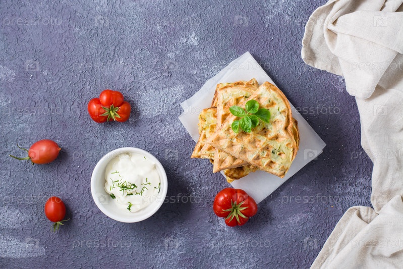 Стопка готовых к употреблению вафель из цуккини и базилика на бумаге для выпечки на столе. Овощное диетическое вегетарианское питание. Вид сверху. Копировать пространство