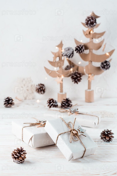 Рождественские подарки, завернутые в крафт-бумагу, перевязанную шпагатом на фоне рождественских елок из картона на деревянном столе. Организация экологичного отдыха. Вертикальный вид