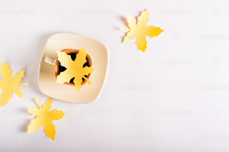 Бумажный кленовый лист на чашке черного кофе на розовом фоне. Вид сверху