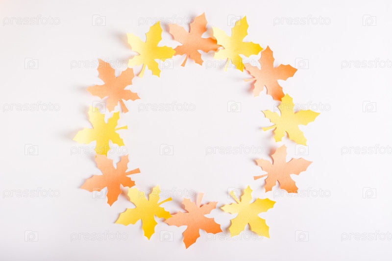 Венок из бумажных кленовых листьев на розовом фоне. Вид сверху