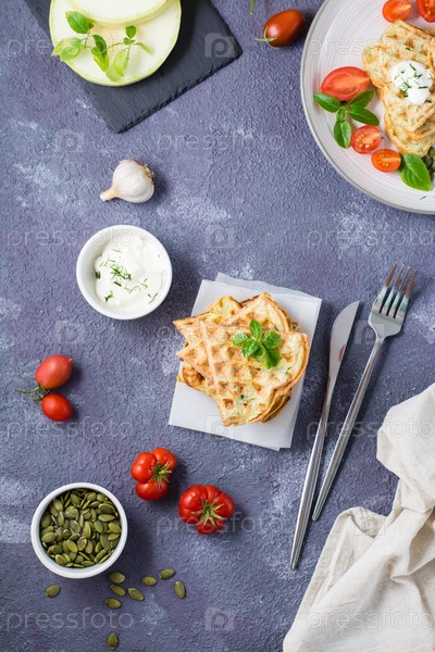 Стопка готовых к употреблению вафель из цуккини и базилика на бумаге для выпечки на столе. Овощное диетическое вегетарианское питание. Верхний и вертикальный вид