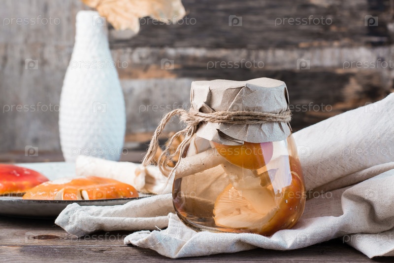 Маринованные мухоморы в банке на деревянном столе. Микродозирование и альтернативная медицина