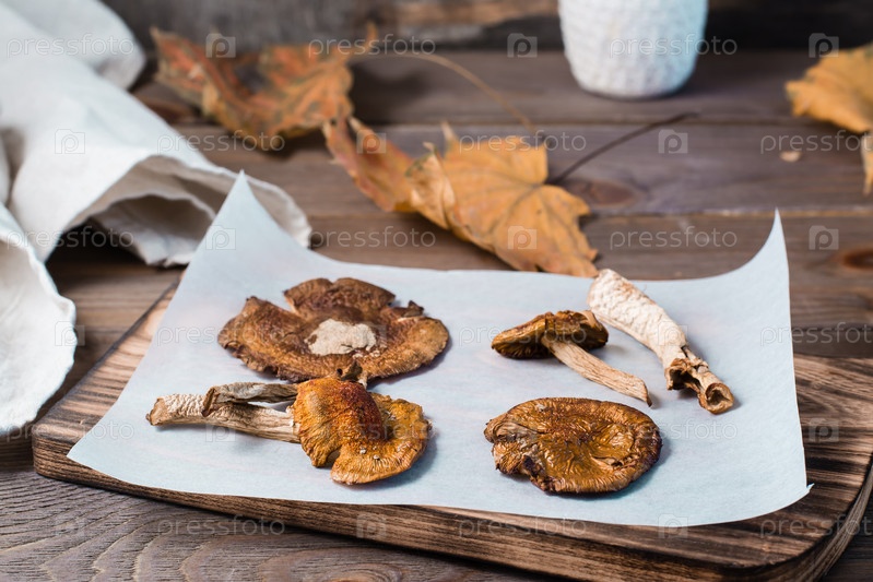 Сушеные мухоморы на пергаменте на деревянном столе. Микродозирование и альтернативная медицина. Крупный план
