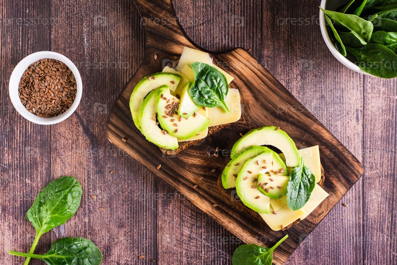 Бутерброды на ржаном хлебе с сыром, авокадо, шпинатом и семенами льна на деревянной доске. Вид сверху