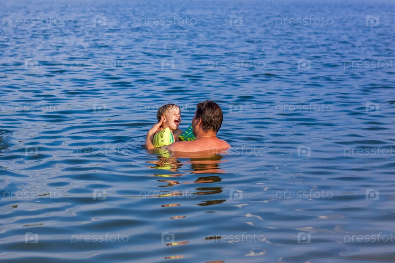 Семья, отец и его сыновья купаются в реке в очень жаркий летний день. Купайтесь в водоемах. Счастливая семья веселится и плещется в воде летом
