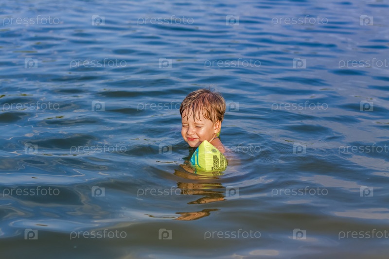 Счастливый ребенок плавает в реке в очень жаркий летний день. Купайтесь в водоемах. Счастливая семья веселится и летом плещется в воде