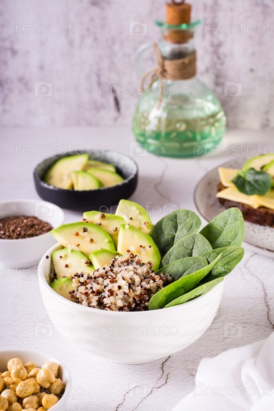 Миска с киноа, авокадо и шпинатом на столе. Органическая диета. Вертикальный вид