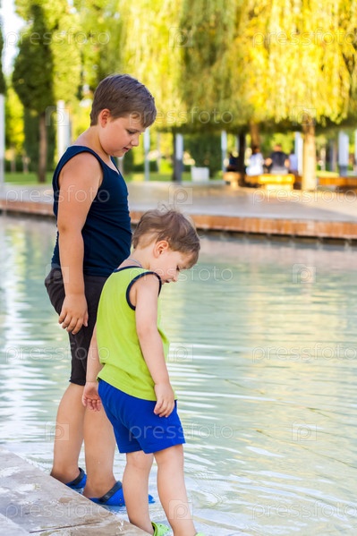 Дети в парке окунают ноги в фонтан, они очень счастливы. Веселитесь и радуйтесь летним дням у фонтана