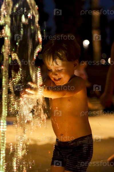 Ребенок резвится в фонтане в парке, он очень счастлив. Веселитесь и наслаждайтесь летним вечером. Прогулки и отдых. Портрет счастливого ребенка