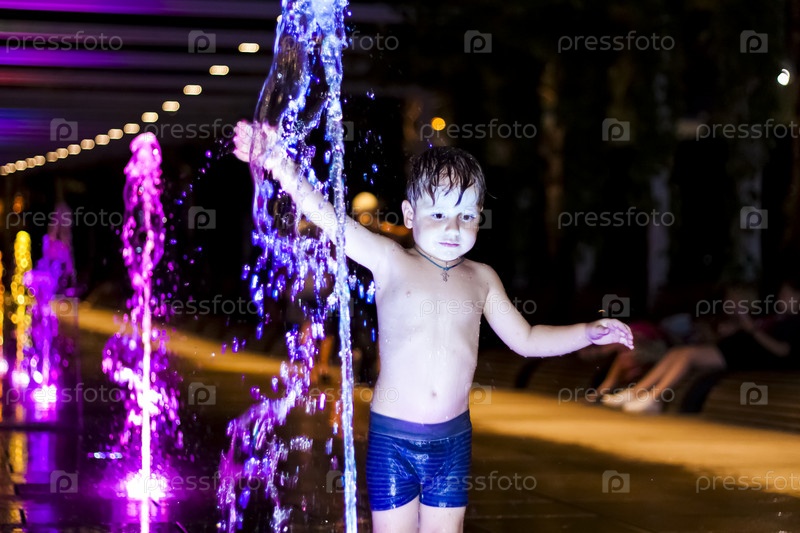 Ребенок резвится в фонтане в парке, он очень счастлив. Веселитесь и наслаждайтесь летним вечером. Прогулки и отдых. Портрет счастливого ребенка