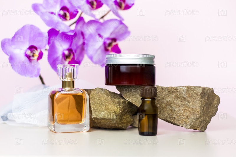 Косметический продукт и флакон духов стоят на камне на фоне красивых орхидей. Стильный внешний вид, планировка, индивидуальность. Баннер, место для текста