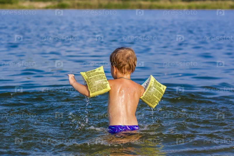 Счастливый ребенок плавает в реке в очень жаркий летний день. Купайтесь в водоемах. Счастливая семья веселится и летом плещется в воде