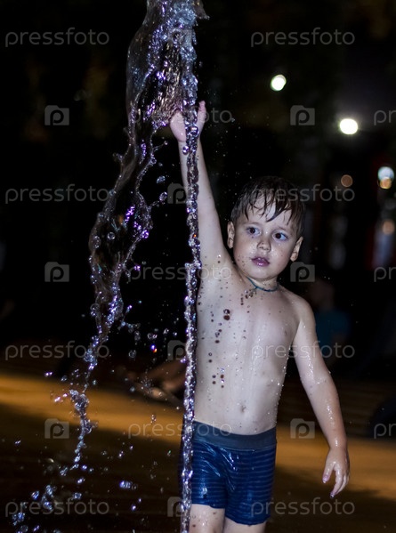 Ребенок резвится в фонтане в парке, он очень счастлив. Веселитесь и наслаждайтесь летним вечером. Прогулки и отдых. Портрет счастливого ребенка