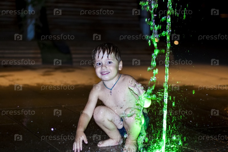 Ребенок резвится в фонтане в парке, он очень счастлив. Веселитесь и наслаждайтесь летним вечером. Прогулки и отдых. Портрет счастливого ребенка