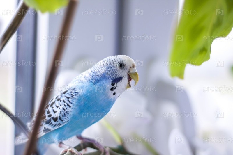 Красивый голубой волнистый попугайчик сидит без клетки на комнатном растении. Тропические птицы дома
