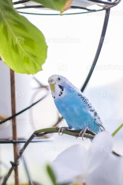 Красивый голубой волнистый попугайчик сидит без клетки на комнатном растении. Тропические птицы дома
