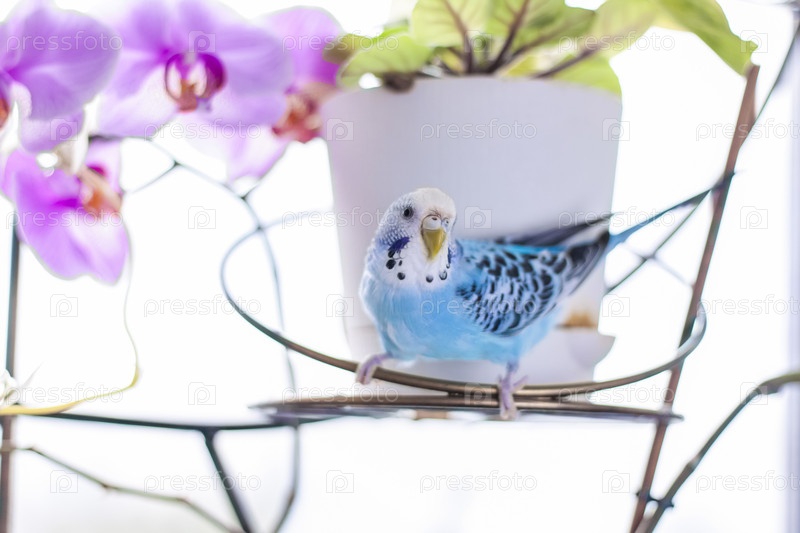 Красивый голубой волнистый попугайчик сидит без клетки на комнатном растении. Тропические птицы дома