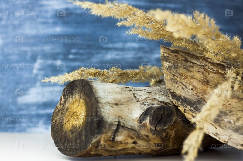 Сухой пень, кора дерева и пушистые стебли на цветном фоне. Стильный внешний вид, планировка, индивидуальность. Баннер, место для текста