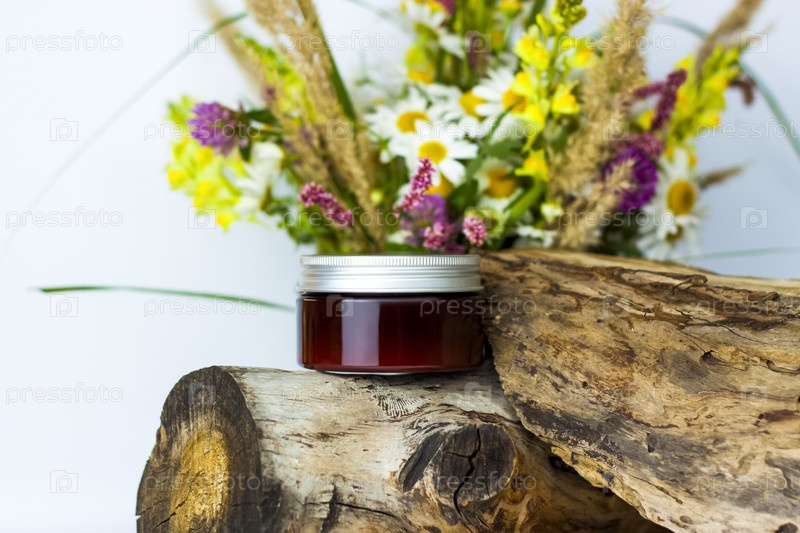 Баночка крема на фоне сухого пня, коры дерева и букета полевых цветов. Стильный внешний вид, планировка, индивидуальность. Баннер, место для текста
